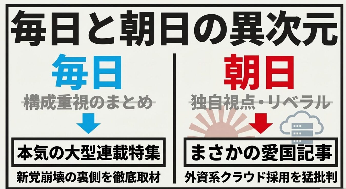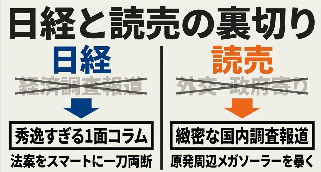 【結論】 世間では「オールドメディアは終わった」と揶揄されるが、実際はネットメディアよりも新聞の方が圧倒的にまともで質が高い。特に、各紙の「お決まりのスタンス」が完全に崩壊し、イレギュラーな良記事が揃い踏みした日の朝刊は、1000円以下で買える最高のエンターテインメントである。