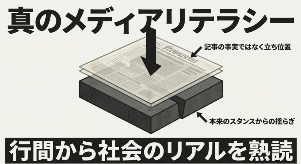 メディアリテラシーとは、単に一つのニュースの事実関係を知ることではない。 各紙がどのようなイデオロギーを持ち、どのような力学でその記事を書いているのか、そして今回のように「本来の立ち位置からどう揺らいだのか」というスタンスの変化を立体的に観察することこそが、真のメディアリテラシーである。 右往左往する政治家や、それを報じるメディアの自己矛盾を嗤い、その行間から社会のリアルな構造を読み解くのだ。