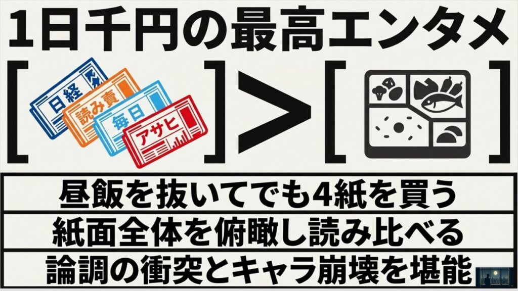 ネットの無料記事を薄く広くつまみ食いして悦に入るよりも、紙面全体を俯瞰し、各紙の論調のぶつかり合いやキャラ崩壊を楽しむ方が、遥かに知的でスリリングだ。 これこそが、1日1000円以下で味わえる「世界最高峰のエンターテインメント」なのである。