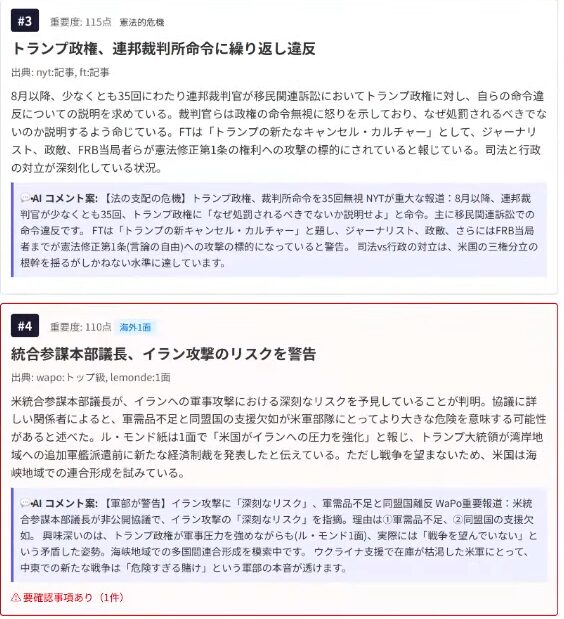 - 自前AIの衝撃: 再生数至上主義のニューメディア(YouTube等)にも限界がある中、ロシア語や中国語を含む海外メディアのRSSを直接AIに翻訳させるシステムが真の言論空間を切り拓く。
