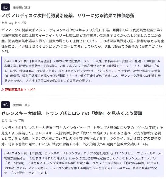 ワシントンポストやニューヨークタイムズといった西側メディアだけでなく、ロシアのコメルサントや中国の人民日報などのRSSフィードを引っ張り出し、AIにロシア語や中国語、ドイツ語、フランス語から日本語へと同時翻訳させるシステムを構築したのだ。向こうのRSSフィードで反響が大きいにも関わらず、日本のメディアに出てきていない記事をランキング上位に持ってくるロジックも組み込んだ。