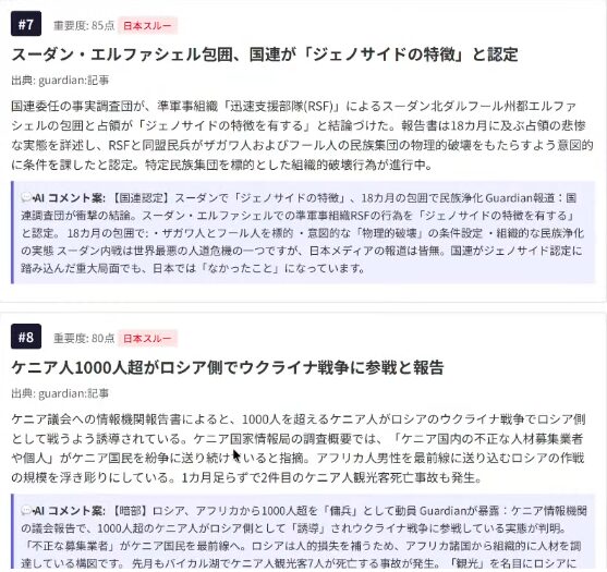 菅野氏がスーダンの話題に入る流れは、自身が構築した「AI情報収集システム」の成果発表からスタートしています。彼はこのシステムに、「海外のニュース配信(RSS)で非常に注目されているのに、日本のメディアでは全く報じられていないニュースを上位に持ってくる」という独自のルールを組み込みました。