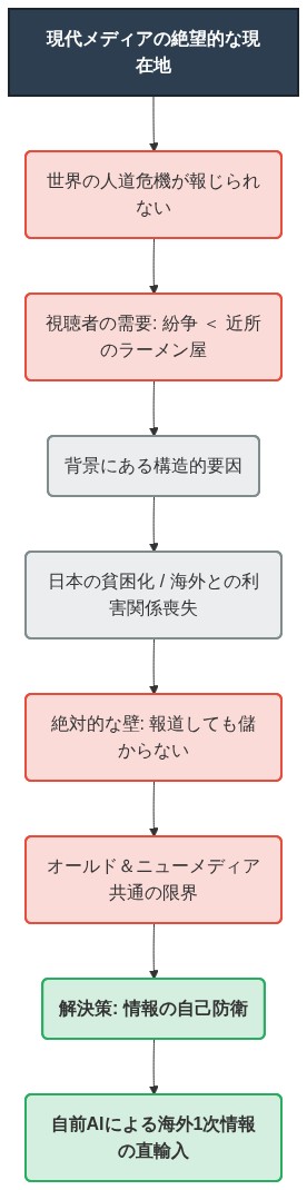 - 報じられない世界的危機: スーダンでジェノサイドが起きているにもかかわらず、日本の視聴者の関心は「徒歩3分のラーメン屋」に向いており、メディアの尺が割かれない。