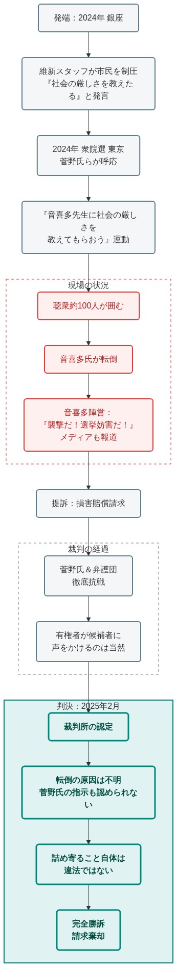 - 疑惑の「転倒」劇: 100人の聴衆が音喜多氏を囲み「社会の厳しさを教えて」と迫った際、音喜多氏が勝手に転倒。これを「襲撃」として訴えたが、裁判所は「誰かに倒された証拠はない」と認定。