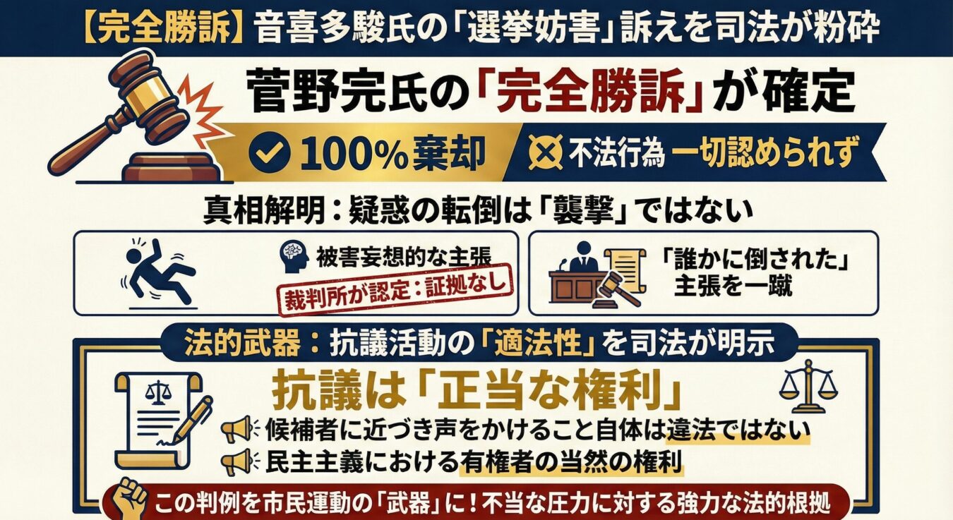 【結論】 菅野完氏が音喜多駿氏から「選挙の自由妨害」等で訴えられた裁判において、裁判所は音喜多氏の主張を全面的に退け、菅野氏の「完全勝訴」が確定しました。