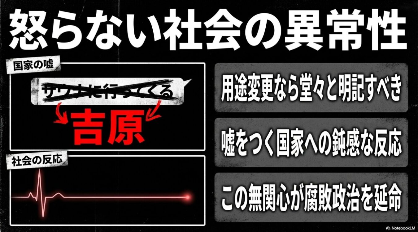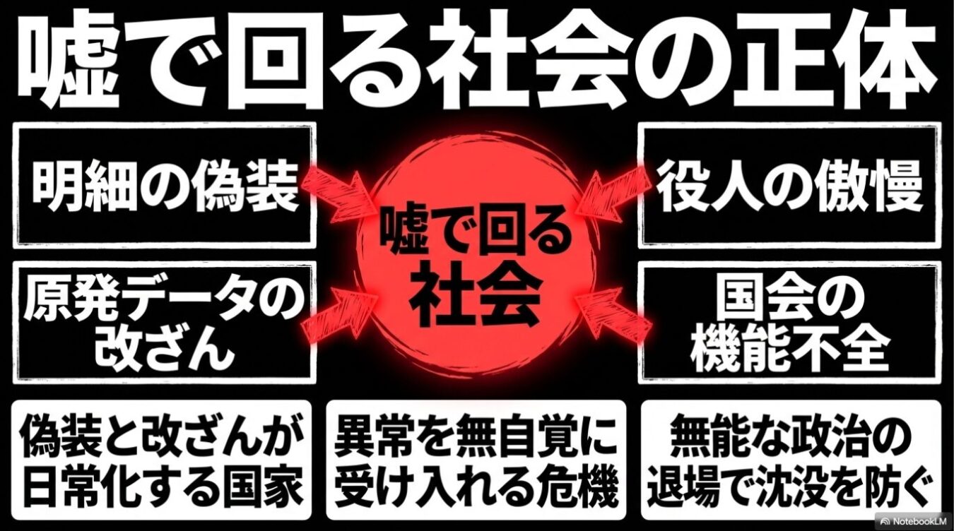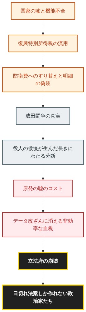 【結論】 「復興」という大義名分を隠れ蓑にして国民の血税を兵器購入に流用する政府の姑息な手口と、それに怒りすら覚えない社会の異常な無関心。そして、役人の傲慢が生んだ過去の分断や、原発の維持という「嘘のコスト」に浪費される血税、さらに法律すら作れない国会の惨状は、この国の政治構造が完全に機能不全に陥っていることを示している。