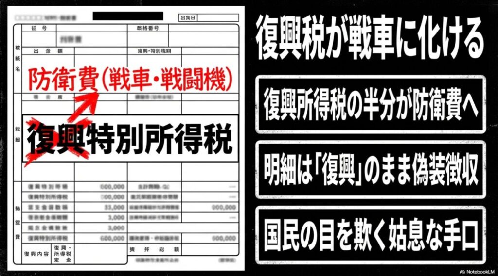 - 東日本大震災の復興目的である「復興特別所得税」の約半分が、給与明細の表記を偽ったまま戦車や戦闘機などの防衛費に流用されている。