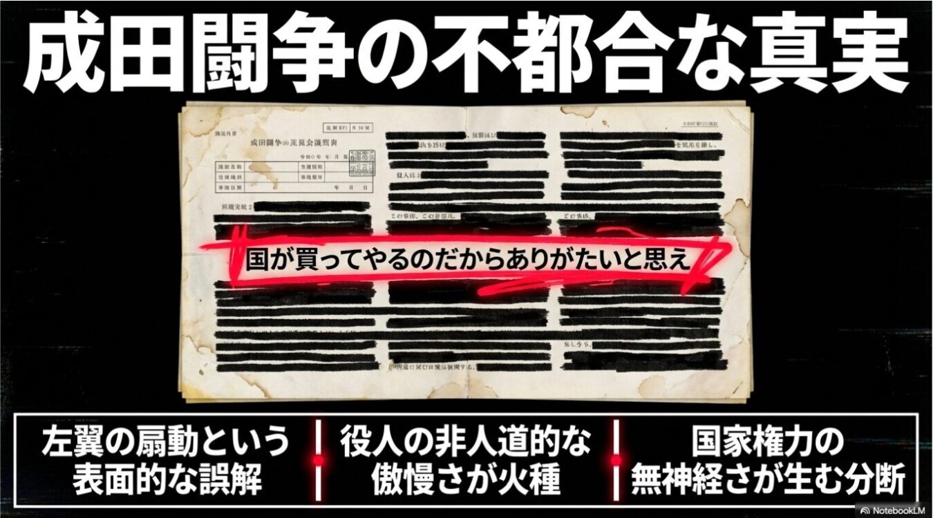 - 成田闘争の真の原因は「左翼の扇動」ではなく、「国が買ってやるのだからありがたいと思え」と言い放った国側(役人)の非人道的な傲慢さにある。