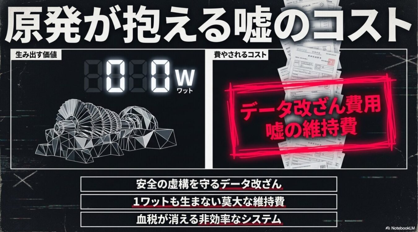 - データ改ざんなど「原発の安全神話」を維持し嘘をつき続けるための莫大なコストは、1ワットの電力も生み出していない完全な無駄である。