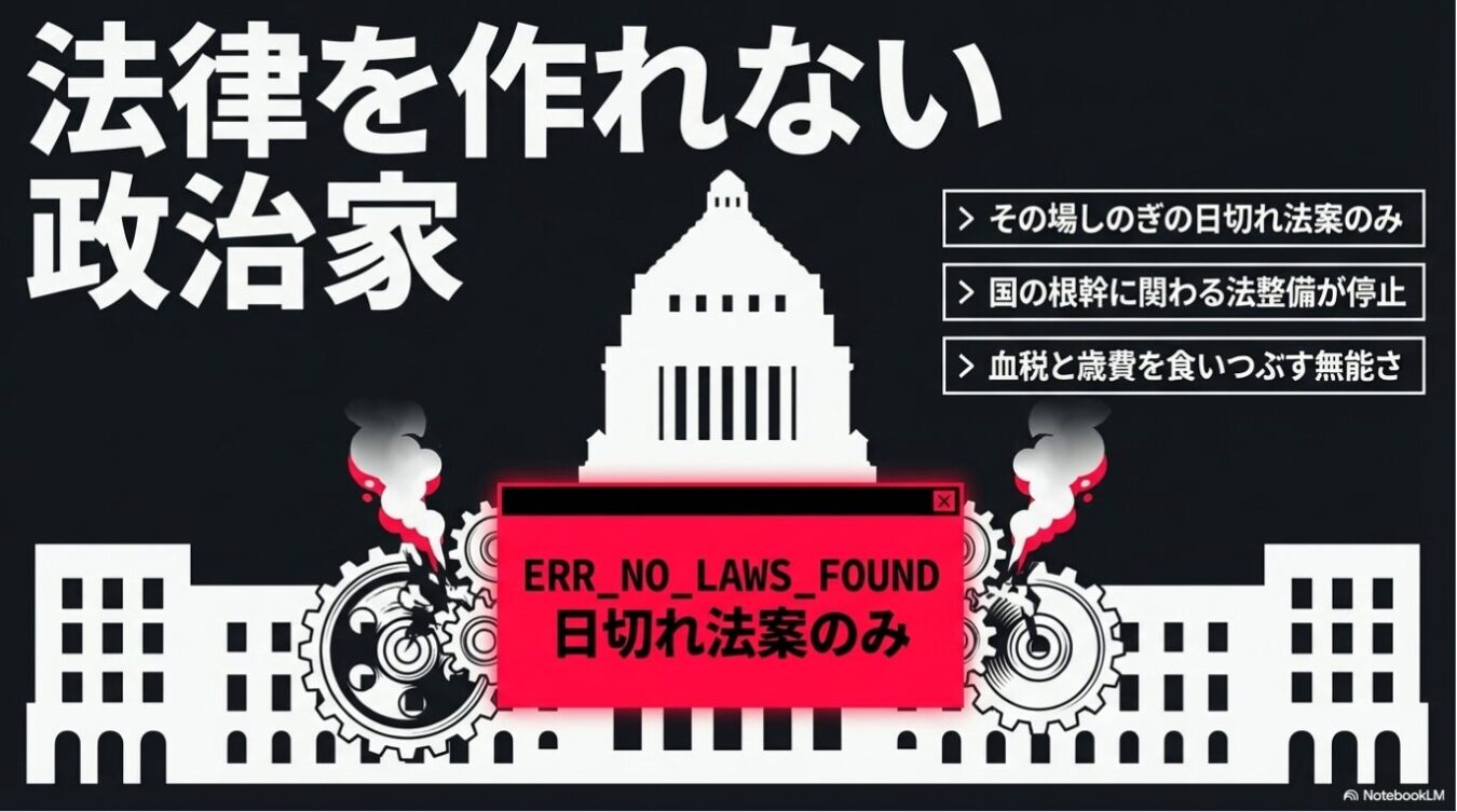 国会における予算審議においても、現在の政治の致命的な機能不全が露呈している。 高市早苗氏をはじめとする政府・与党は、その場しのぎの「日切れ法案(期限付きの法案)」の処理に追われ、国の根幹に関わるようなまともな法律を成立させるに至っていない。 予算が年度内に成立せず暫定予算を組むこと自体は、制度上想定された手続きであり、直ちに否定されるべきものではない。 しかし、立法府に属する国会議員が「法律そのものを立案・成立させられない」という異常な状況は、とうてい看過できるものではない。 彼らは一体、何のために国民の血税から歳費を受け取っているのか。無能な政治家たちを退場させない限り、この国の沈没は決して止まらないのである。