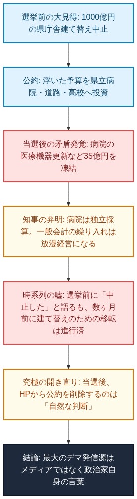 すでに事業が進行し、行政の部署移転まで始まっていたにもかかわらず、選挙戦の最中になって突然「中止しました」と過去形でアピールする。3ヶ月前に自ら動かしておきながら、3ヶ月後には「止めた」と言う。事実の時系列を平然と歪曲する、恐るべき詐術である。