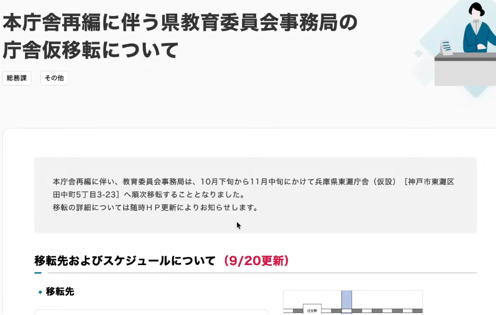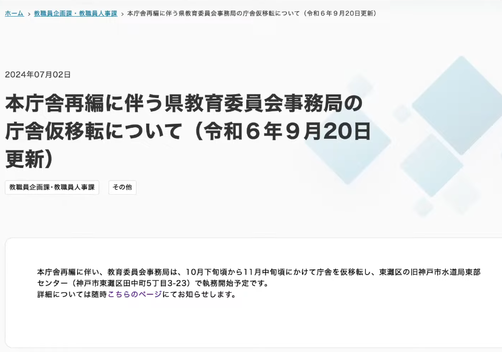 しかし、現実は全く異なる。令和6年(2024年)の兵庫県のホームページには「本庁舎再編に伴う県教育委員会事務局の庁舎移転について」として、「10月下旬から11月にかけて庁舎を移転し」と明確に記載されている。実際にはその数ヶ月前の7月頃から、教育委員会の仮移転はすでに着手され、既成事実として進行していたのである。