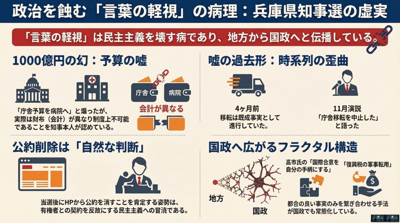 2024年11月の兵庫県知事選で起きた熱狂。熱狂の中心にあったのは、「県庁舎の建て替えを見直し、浮いた予算を生活に直結する医療や教育に回す」という、一見すると極めて真っ当な主張であった。しかし、その根底にある「言葉の軽視」という病理は、遠く離れた永田町で起きているある現象と不気味なほどに符合している。知事自身、同年11月7日のマイスター工房八千代前での街頭演説において、「この1000億をもし使ってしまえばですね、この地域も含めた道路の整備であったりとか、あの県立病院の整備、そして県立高校の投資とか、いろんな県民の皆さんにとって直接大事な施策(中略)ができなくなる可能性がある」と有権者に直接語りかけている。この言葉を聞けば、「県庁舎の莫大な予算を止めれば、その分が病院整備に回ってくる」と有権者が期待するのは、ごく自然なことだったと言えるだろう。しかし、その期待は就任後、脆くも崩れ去ることになる。