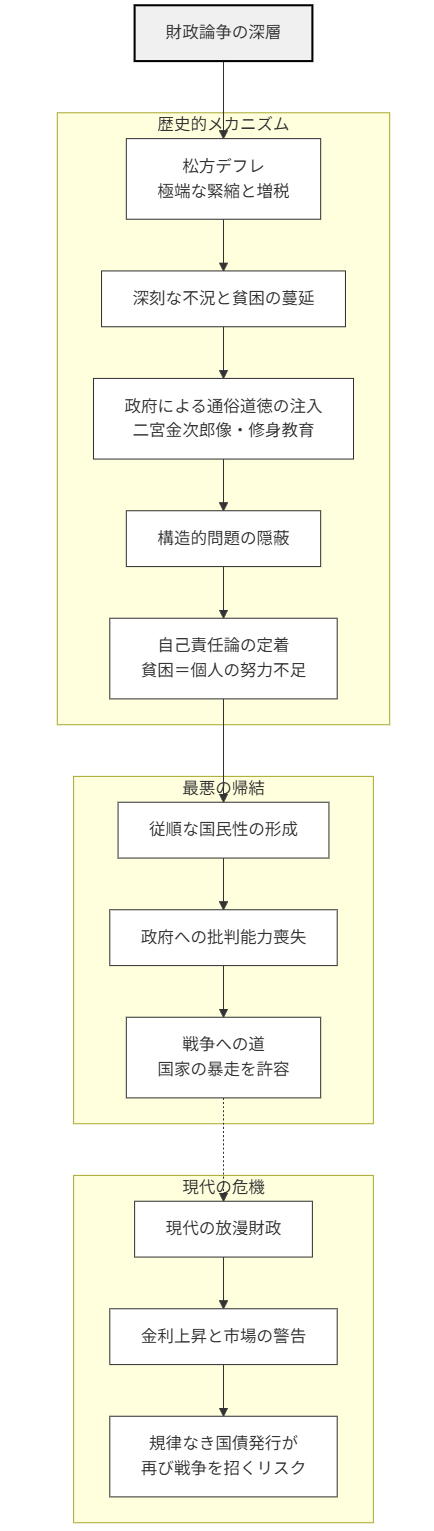【結論】 「緊縮財政」と「積極財政」の対立は、単なる金勘定の話ではない。それは「社会の構造的な欠陥を直視するか」あるいは「すべてを個人の心の持ちよう(自己責任)に矮小化するか」という、国家のあり方を巡る思想闘争である。松方デフレから続く「清貧の思想」が、いかにして日本人を「戦争へ突き進む従順な羊」に変えたのか。その歴史的メカニズムを解き明かし、現代の「無責任な国債乱発」が招く破局への警鐘を鳴らす。