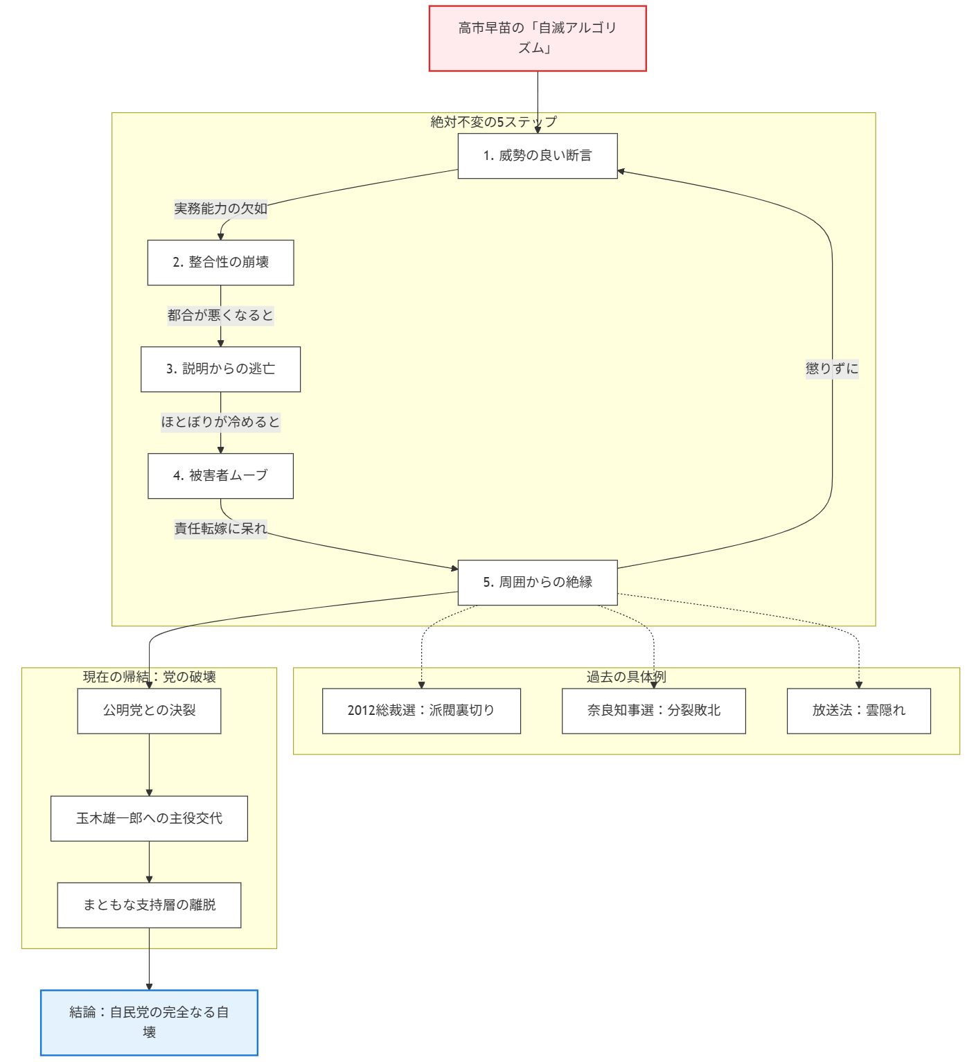 このパターンは、高市氏が政治家として最もやってはいけないことをずっと続けている結果であるとされています。
