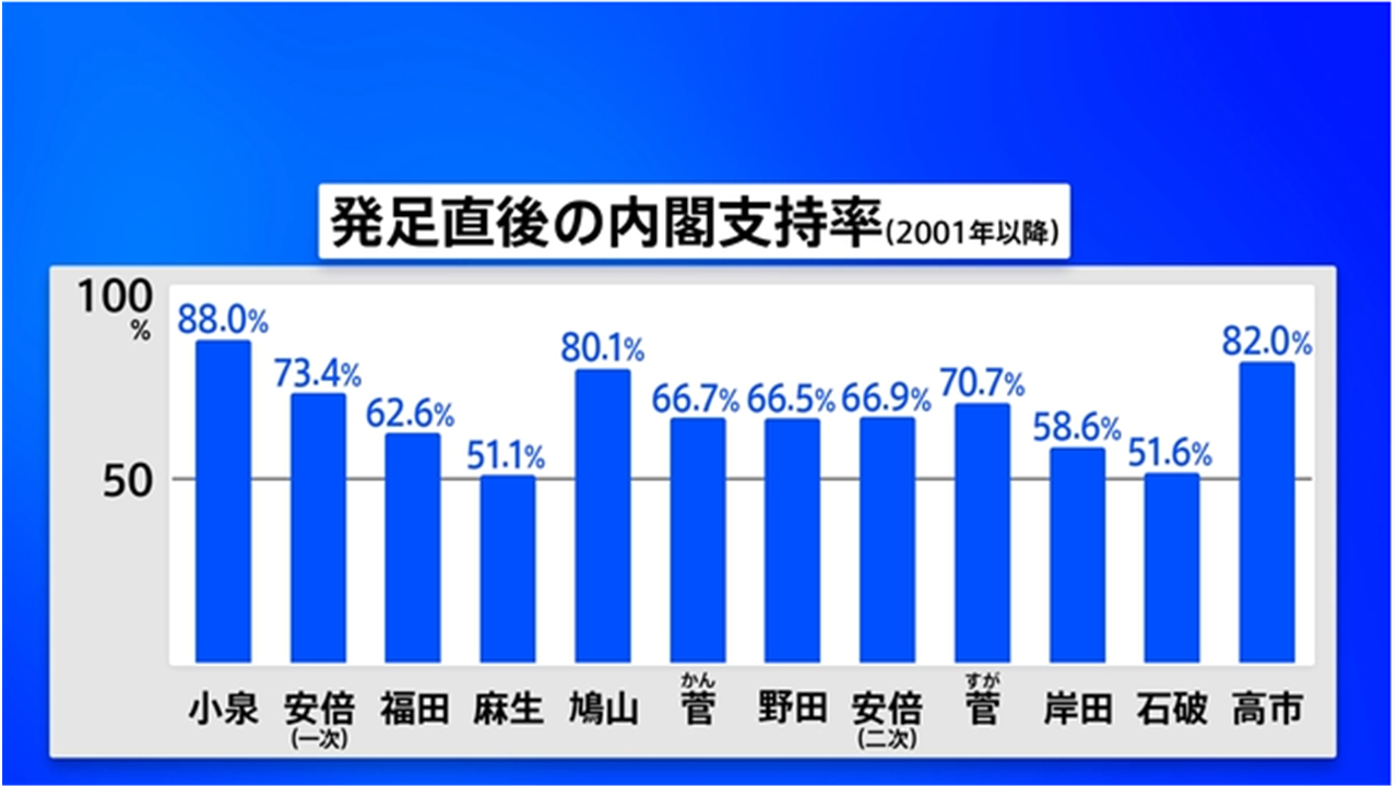 • 内閣支持率: 82%超(小泉純一郎政権に並ぶ高水準)