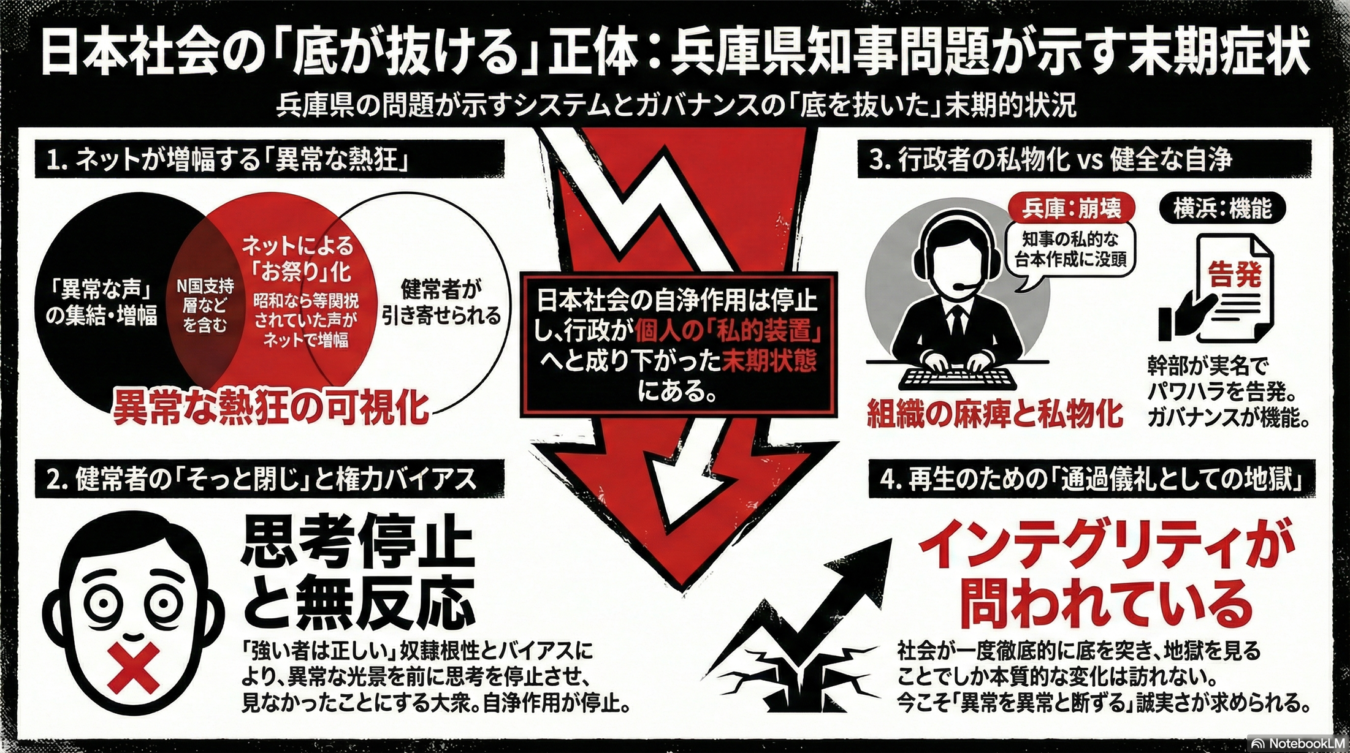この記事の結論: 兵庫県知事問題の本質は、ネットで増幅された「異常な少数派」の声に対し、健常な多数派が「そっと閉じ」を決め込むことで社会の底が抜けてしまう構造的欠陥にある。