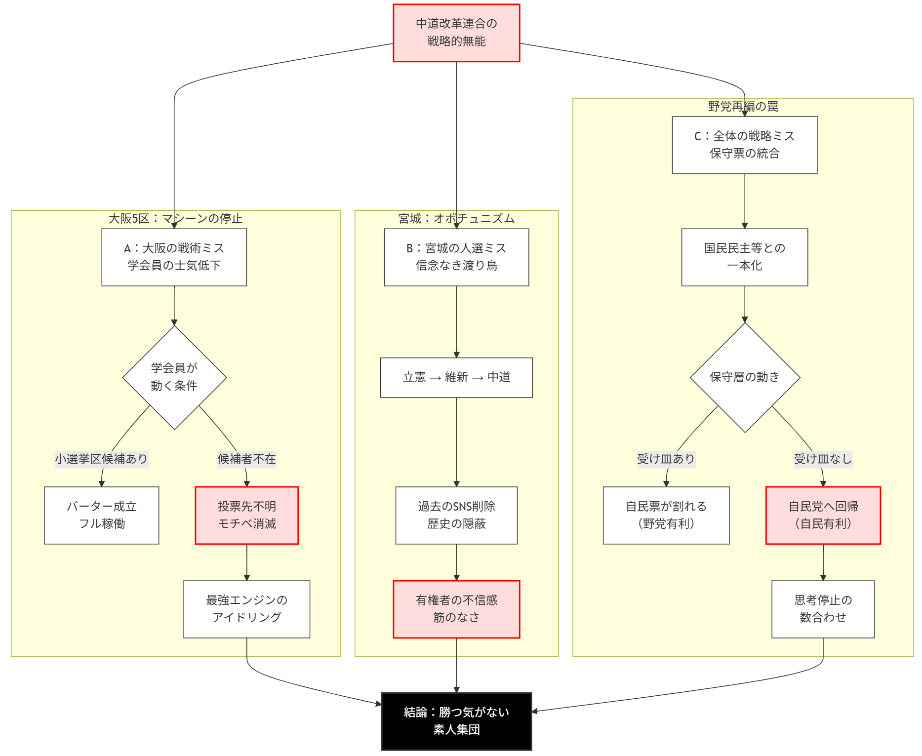 【結論】 「中道改革連合」は選挙のド素人である。創価学会という「最強の集票マシーン」を擁しながら、大阪5区(国重氏)に独自候補を立てないのは、エンジンの掛け方を知らない証拠だ。さらに宮城では理念なき「渡り鳥」候補を擁立し、中央では国民民主党を取り込んで保守票の受け皿を壊そうとしている。これらはすべて、自民党を利するだけの「戦略的自殺行為」である。