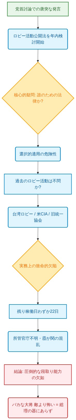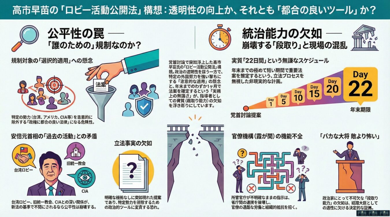 【結論】 党首討論における高市早苗氏の「ロビー活動公開法」年内検討開始発言は、単なる失言や準備不足の次元を超えた、致命的な「統治能力の欠如」を露呈した。特定の国や団体(台湾、アメリカCIA、旧統一協会など)を選択的に免罪しかねない恣意的な制度設計の危うさもさることながら、残り1ヶ月(実働約22日)で重要法案を策定するという「段取り能力の完全なる欠如」こそが最大の問題である。政治の要諦である「段取り」ができない人間に、国家の舵取りなど到底不可能だ。