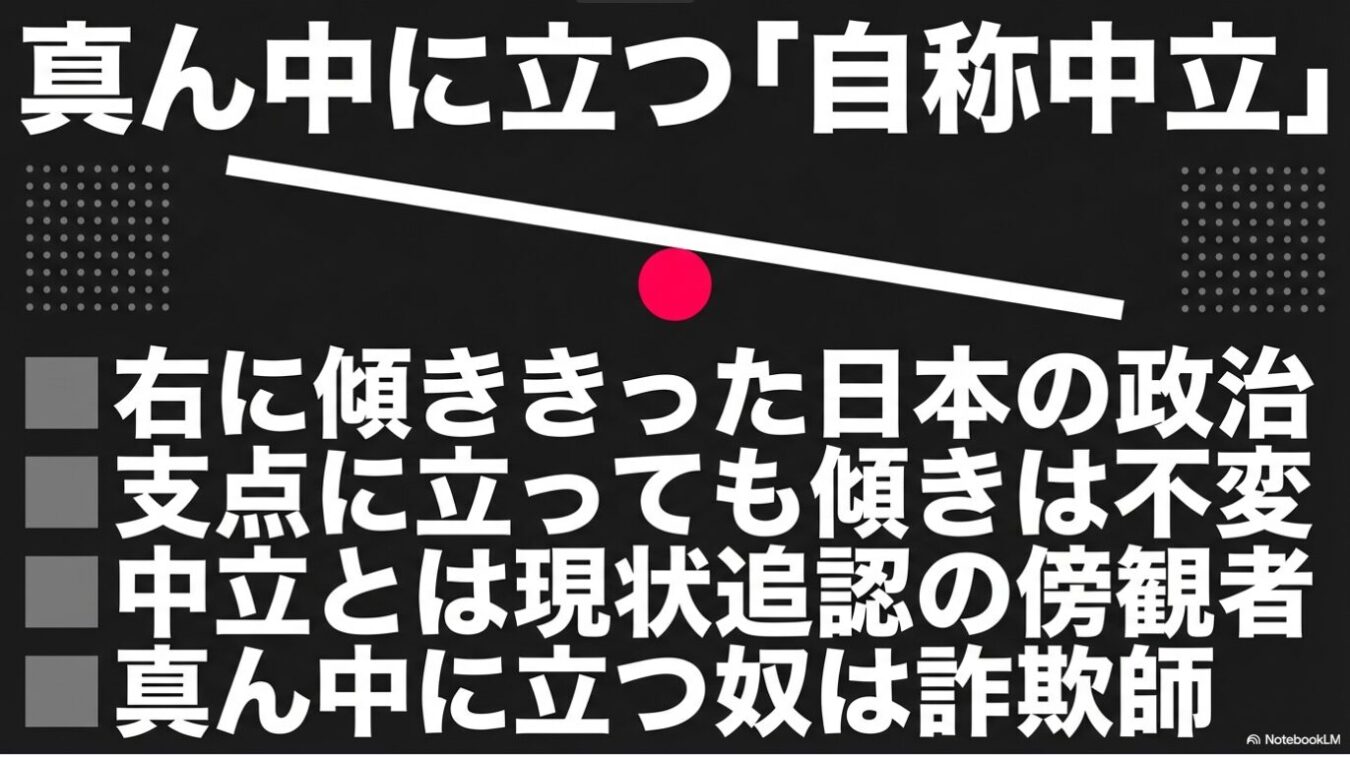 - 傾いたシーソーと「自称・中立」の欺瞞:右に激しく傾いた状態で真ん中に立つのは、バランスをとるどころか現状追認の防観者にすぎない。これを「詐欺師」「人間のクズ」と物理的真理で一刀両断する。
