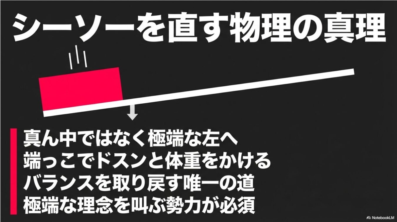 もしこの国の狂ったシーソーの傾きを本気で直したいなら、真ん中に立つんじゃなくて、極端に「左」の端っこに立ってドスンと体重をかけなきゃダメなんです。それが物理の真理です。