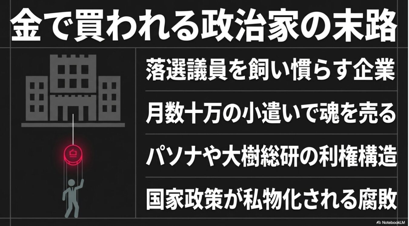 よう考えてみよ。自民党の政治家やったら、選挙で落選してプー太郎になっても食いっぱぐれないんですよ。大樹総研とかパソナとか、わけのわからんフィクサー気取りの会社のおっさんが「タニマチ」のふりをして、落選した議員を拾うんです。どっかの研究所の客員教授にしたり、社外取締役にしたりして、月々20万とか30万の小遣いを渡して飼い殺しにする。
