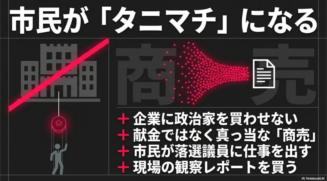 - 月1万円のリベラル「タニマチ」宣言:金持ちの道楽ではなく、貧乏人が100人集まり月1万円を出して政治家の時間を買う。これが本物のリベラルを育て、腐敗を防ぐ最強の防衛策である。