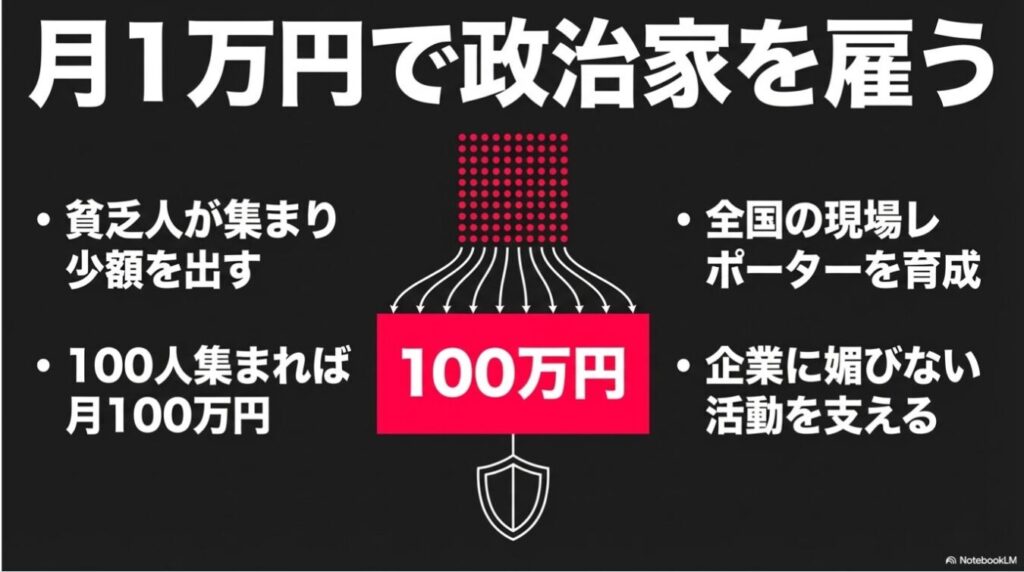 だから一口1万円なんです。どんな大金持ちでも日経新聞を1日に100部も買わないのと同じで、一人が大金を出すんじゃなく、貧乏人が100人、1000人と集まって毎月1万円ずつ出す。100人集まれば月100万円。これで全国の「現場レポーター(政治家)」を雇えるんです。
