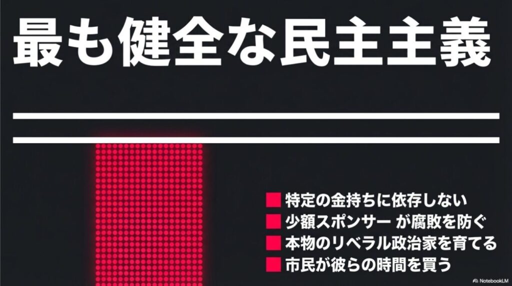 しょうもない会社の役員になって月30万で魂を売るくらいなら、市民100人から集まった金でレポートを書く方が、よっぽど彼らも胸を張って政治活動ができるでしょ。隣を通るダンプカーに怯えながら媚び売る必要もない。パソナに買われる前に、俺たち市民が月1万円で彼らの時間を買う。これが、腐敗を防ぎ、本物のリベラル政治家を育てるための「最も健全な民主主義」の実践なんですよ。