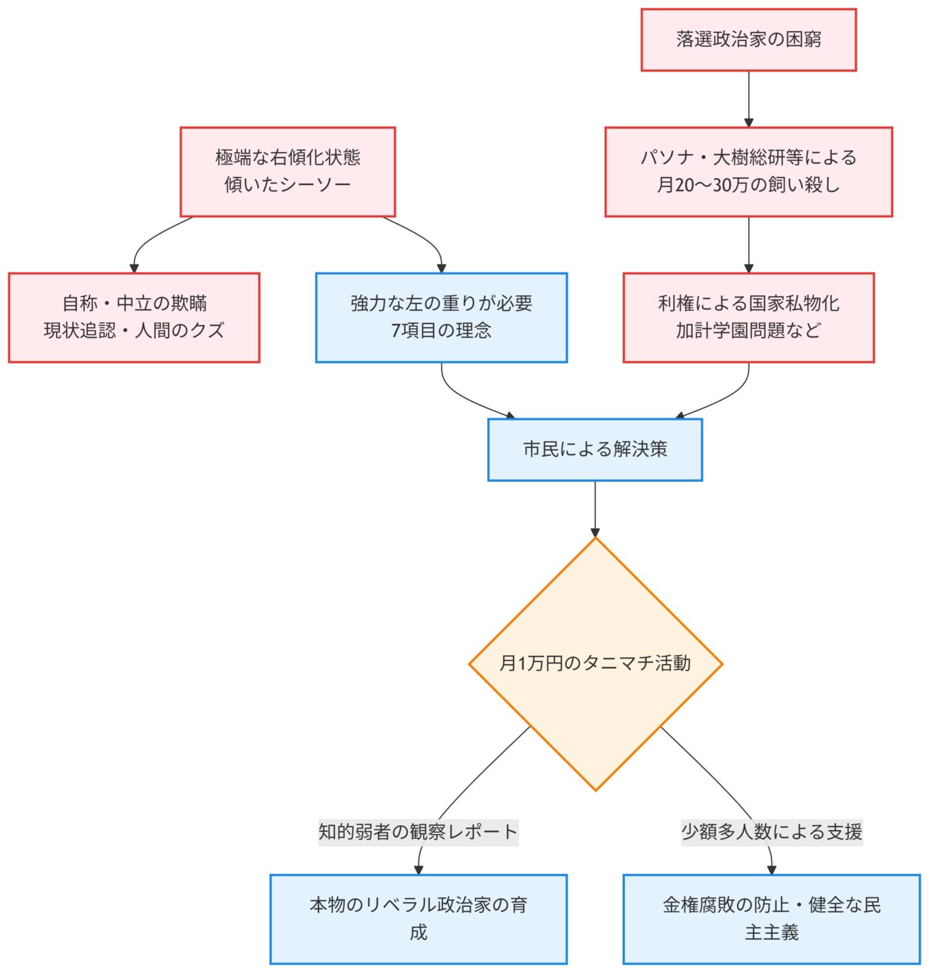 極端に右傾化した現在の政治状況において、シーソーの中心に立つ「自称・中立」は事実上の右派加担であり、人間のクズに等しい。落選中の政治家が大樹総研やパソナのようなフィクサーに端金で買われ、利権の奴隷となるのを防ぐためには、強力な左の対抗軸が必要だ。市民が一口1万円の「タニマチ」となり、リベラル政治家に「知的弱者の観察レポート」を書かせるという、極めて健全な民主主義の防衛策を提唱する。