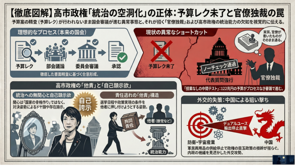 【結論】 現在の国会は、予算レクすら終わっていない段階で代表質問が行われるという異常なスケジュールで進行しており、与野党ともに国家予算を精査できていない状態です 。高市首相の巧みな答弁がエンターテイメントとして消費される裏で、実際には官僚の作成した予算案がノーチェックで通過する「官僚独裁」が横行しており、首相自身の「統治への無関心」と「他責」の姿勢がこの危機的状況を助長しています 。+4