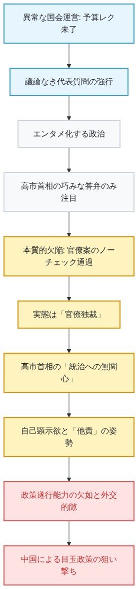 なぜこのような事態が放置されるのか。本質的な問題は、高市首相自身が国家の統治に興味を持っていないことにあると分析せざるを得ない。