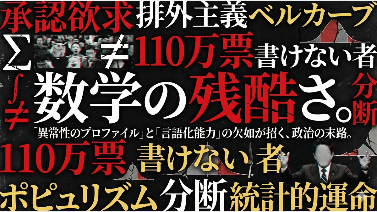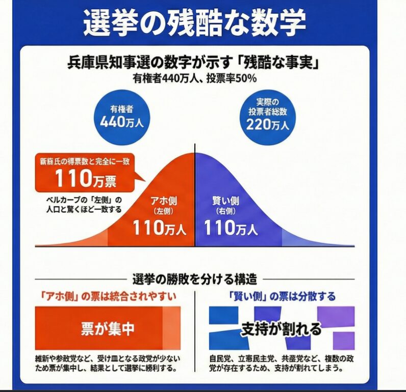 この約110万票という数字は、斎藤元彦氏が実際に獲得した得票数と、不気味なほど完全に一致する。これは偶然ではない。菅野氏によれば、これは斎藤氏の選挙戦略が、まさにこの「正規分布の左側」の票を最大化することに特化していたことの数学的な証明なのである。イデオロギーの優劣ではなく、統計的確率が勝利を導いたのだ。