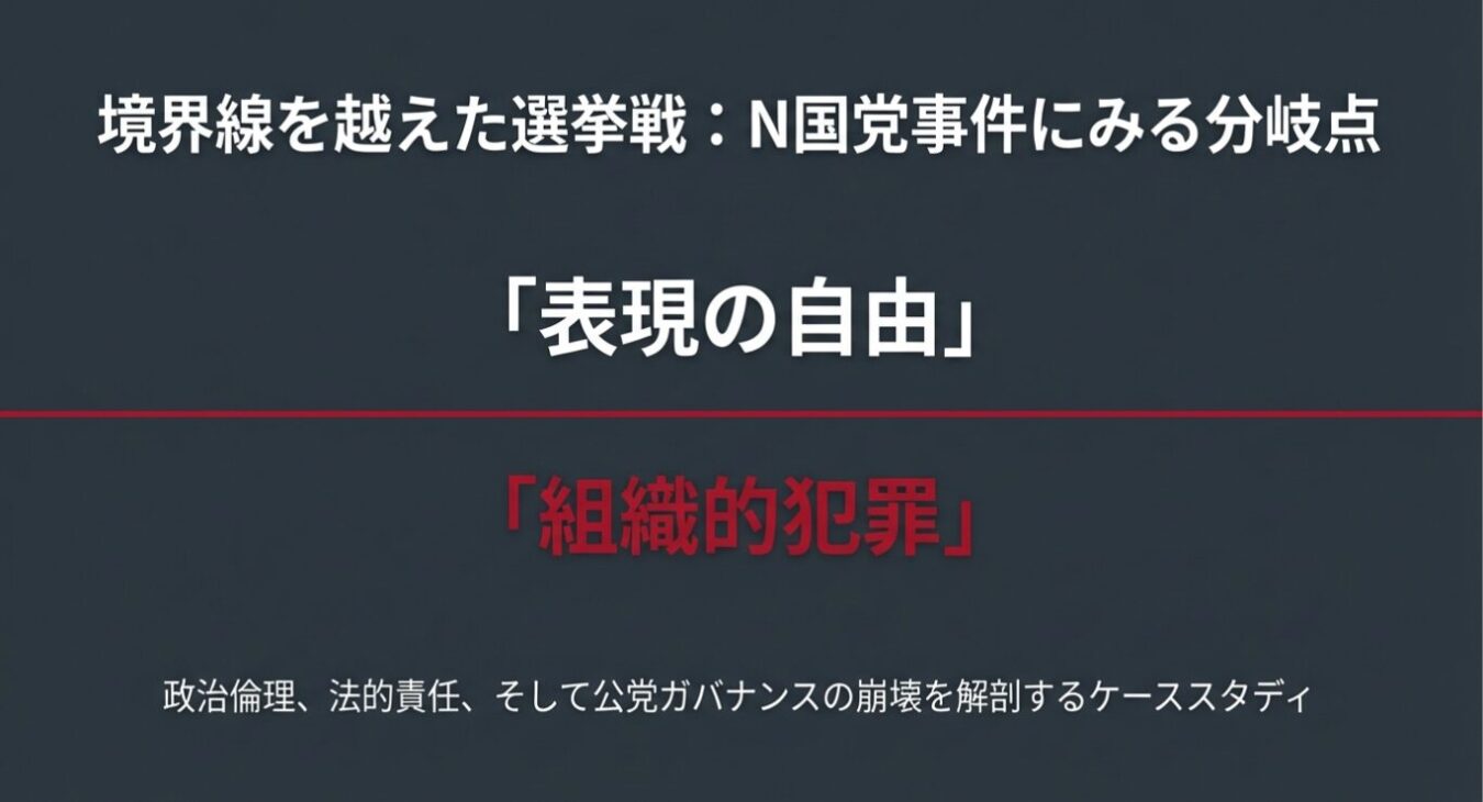 捜査機関が「組織的犯行」と認定したことは、本件がN国党のガバナンスとコンプライアンスの著しい欠如を露呈した事例であることを示しています。党首の指示、あるいは少なくとも黙認のもとで、違法行為が公的な選挙活動として実行されたのであれば、それは候補者個人の責任に留まらず、政党全体の責任問題へと発展します。
