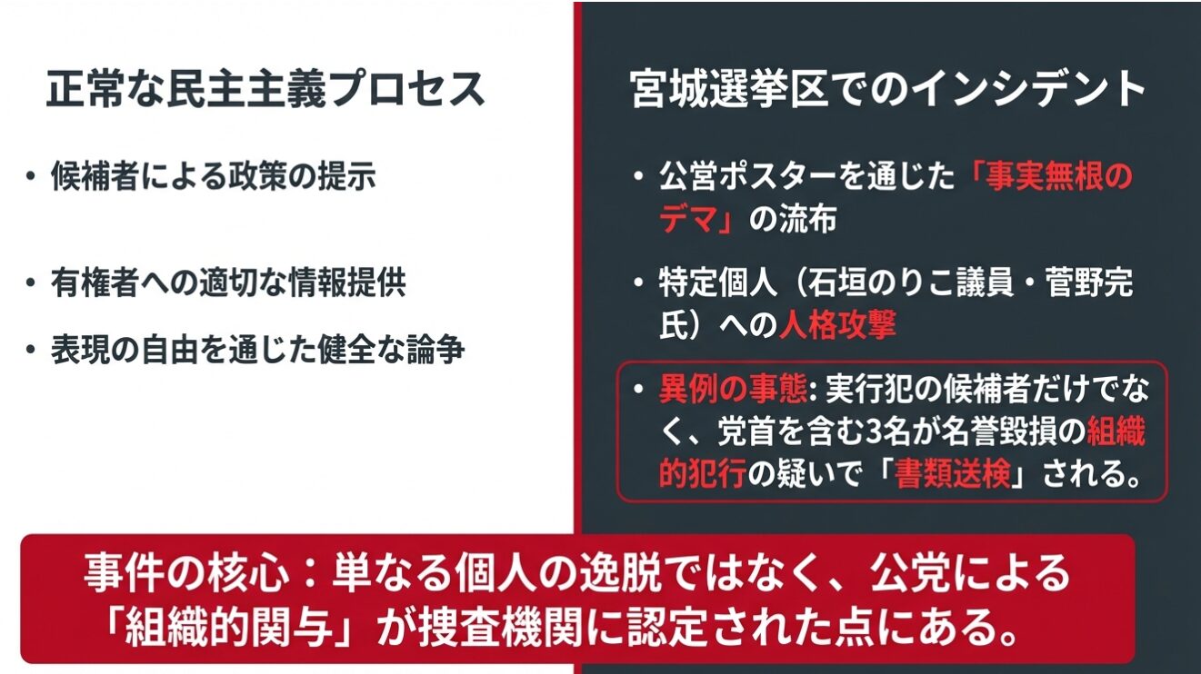 本件は、ある参議院選挙(宮城選挙区)におけるN国党の選挙活動を巡り、事実無根の内容を記したポスターが掲示されたことに端を発します。これに対し、名誉を毀損されたとして被害者から刑事告発がなされ、結果として同党の党首を含む3名が書類送検されるに至った事件です。政治倫理と法的責任が厳しく問われる、象徴的な事例と言えるでしょう。