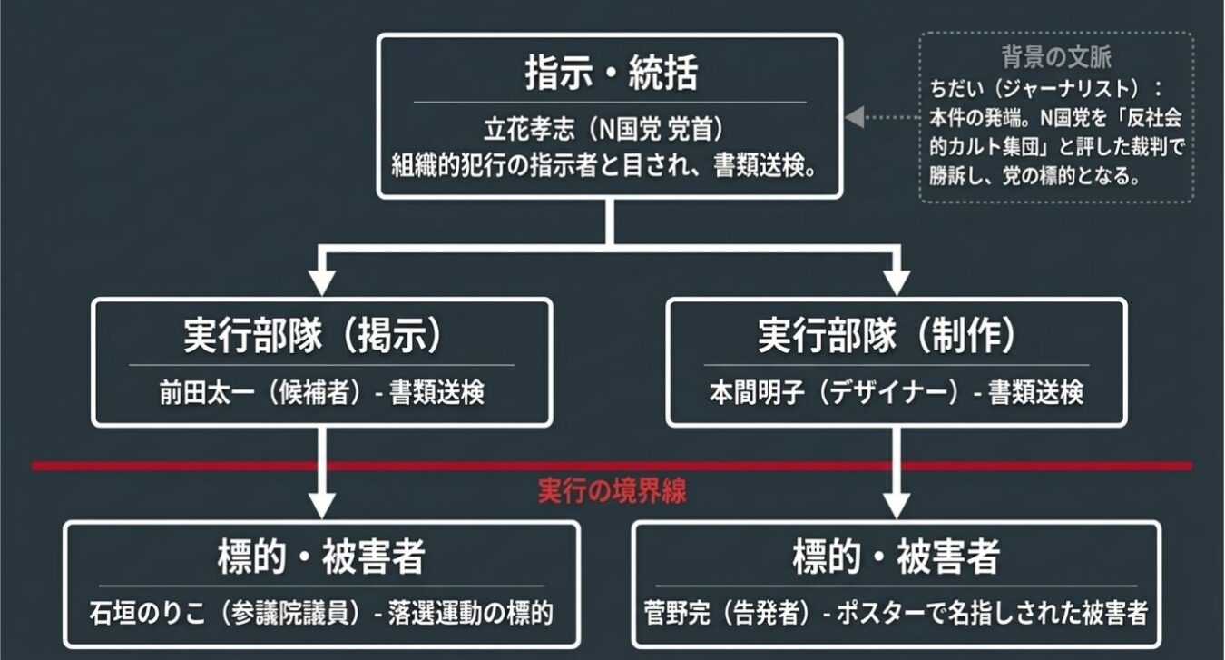 - 司直が下した「組織的犯行」の鉄槌: 現場の実行犯(候補者)のみならず、指示を出した党首、デザインを担当した党関係者の計3名が書類送検されたという事実の重み。