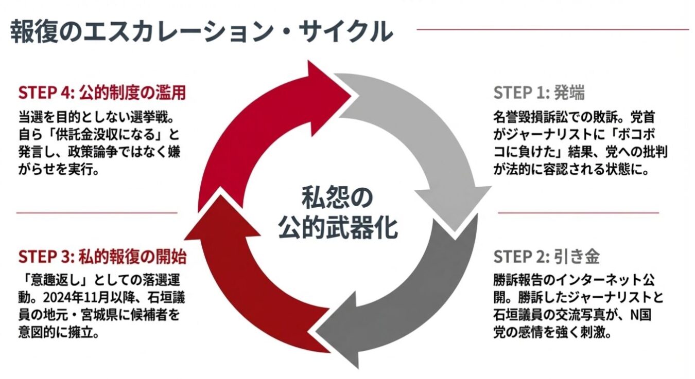この写真公開をきっかけに、N国党は「意趣返し」として、石垣議員の選挙区である宮城県に候補者を擁立し、組織的な落選運動を開始しました。この動きは、名誉毀損訴訟の判決が出た2024年11月以降、本格化したものです。特定の個人への報復を目的として、選挙という公的な制度が利用され始めた瞬間でした。