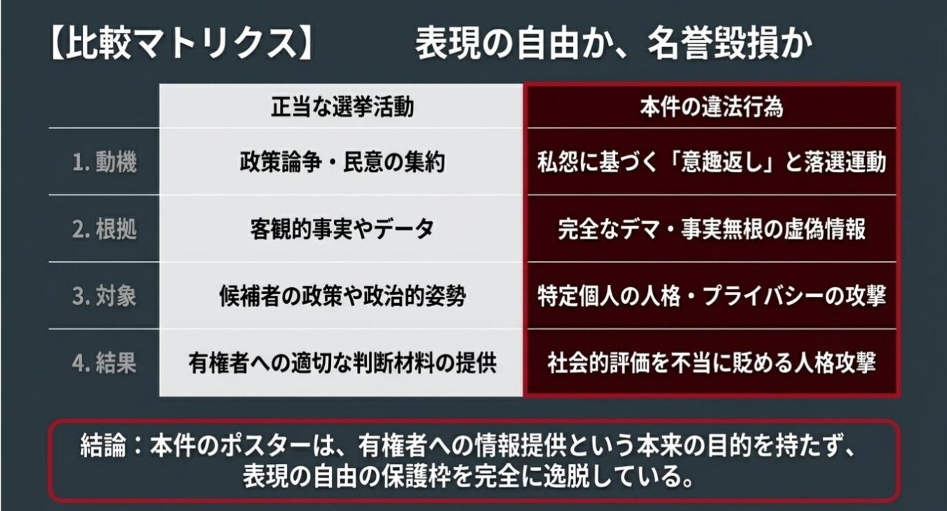 選挙運動において、候補者の資質や政策に対する批判は、有権者が適切な判断を下すための重要な情報源であり、表現の自由として広く保障されるべきです。しかし、本件のポスターは、その境界を明確に逸脱していると見なされます。