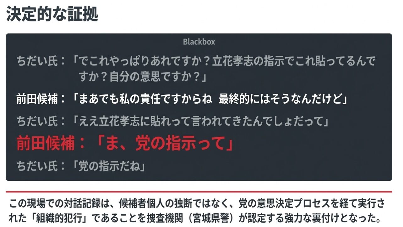 このやり取りは、候補者個人の独断ではなく、党の意思決定プロセスを経て実行された組織的行為であることを強く示唆しています。