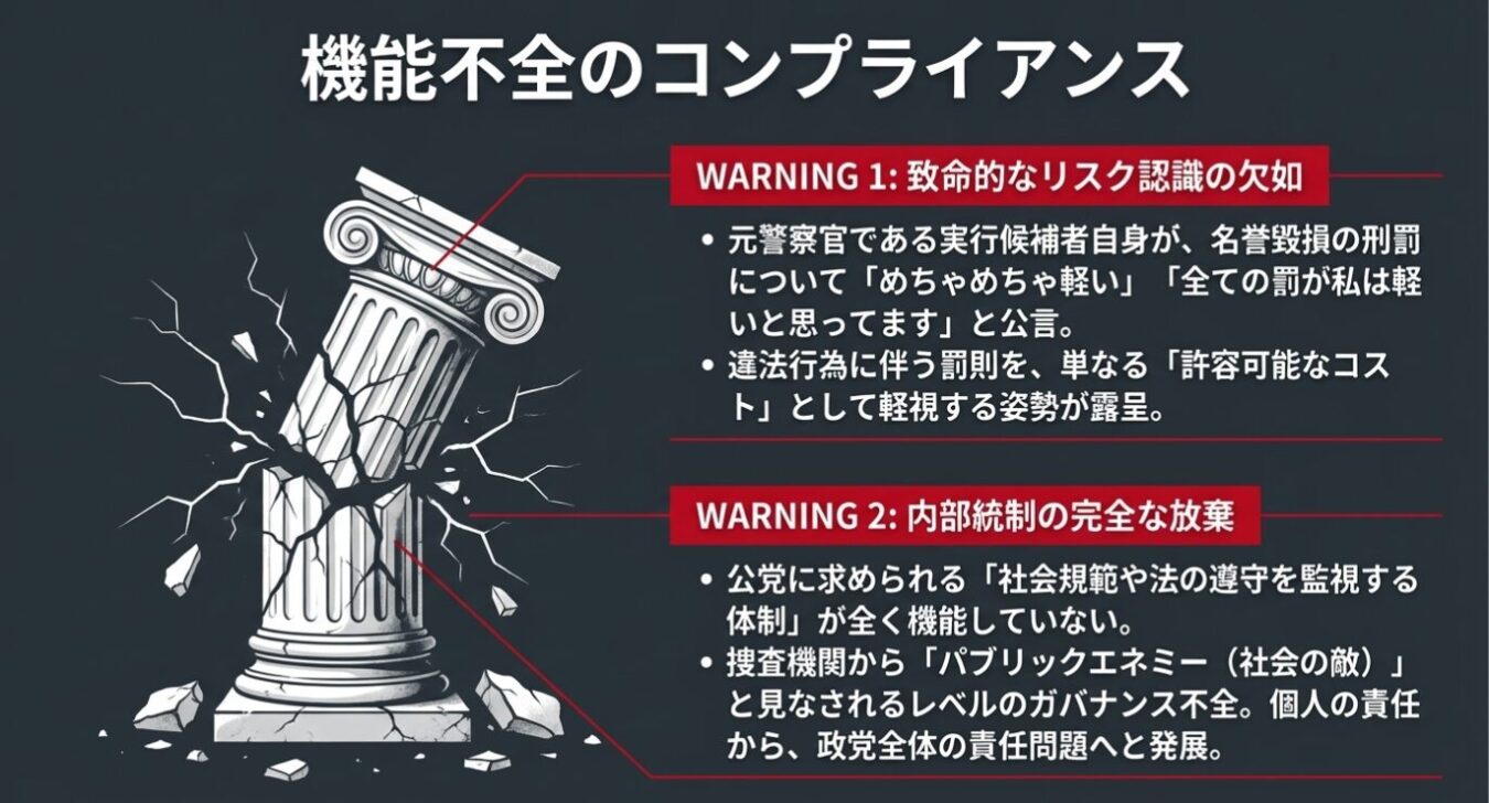 さらに深刻なのは、違法行為に対する組織内の認識の欠如です。元警察官である前田候補は、取材に対し、名誉毀損の刑罰について「めちゃめちゃ軽い」「全ての罰が私軽いと思ってます」と発言しています。これは、法的な制裁を意に介さず、違法行為に伴う罰則を単なる「許容可能なコスト」と見なす、極めて問題のあるリスク認識を示しています。このような姿勢は、コンプライアンス体制が機能不全に陥っていることの証左に他なりません。