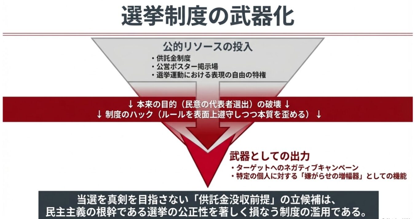 最も深刻な問題は、選挙制度が本来の目的である「民意の代表者の選出」から逸脱し、特定の個人や団体への報復や嫌がらせの手段として「武器化」されたことです。候補者が当選を真剣に目指すことなく、自身の選挙が「供託金没収になるでしょうね」と公言し、他候補へのネガティブキャンペーンのみを目的とする活動は、民主主義の根幹である選挙の公正性を著しく損ないます。