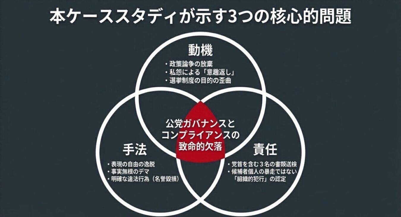 これは、制度のルールを表面的に遵守しつつ、その本質的な目的を破壊する行為であり、重大なコンプライアンス上の失敗です。このような制度の濫用が横行すれば、選挙は健全な政策論争の場ではなくなり、誹謗中傷が渦巻く場へと堕してしまうリスクを孕んでいます。