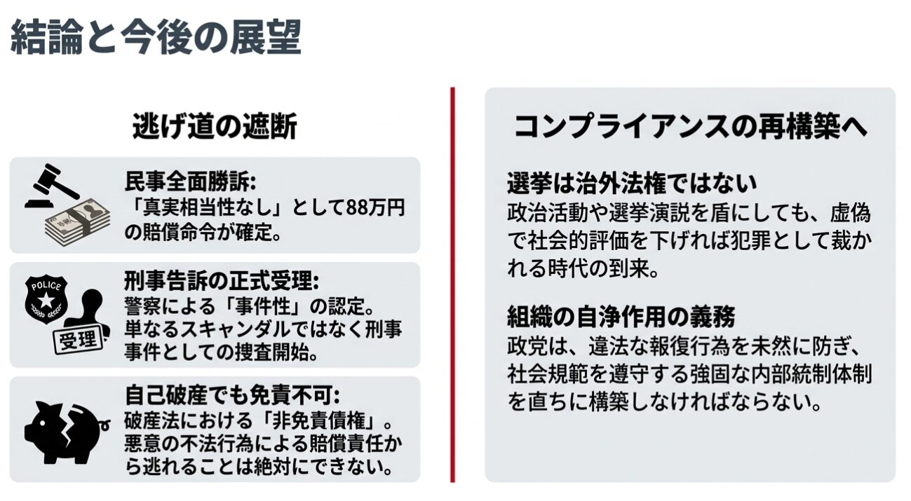 - 手法の問題: 表現の自由を逸脱し、「事実無根のデマ」を用いた組織的な名誉毀損という、明確な違法行為が手段として用いられた点。