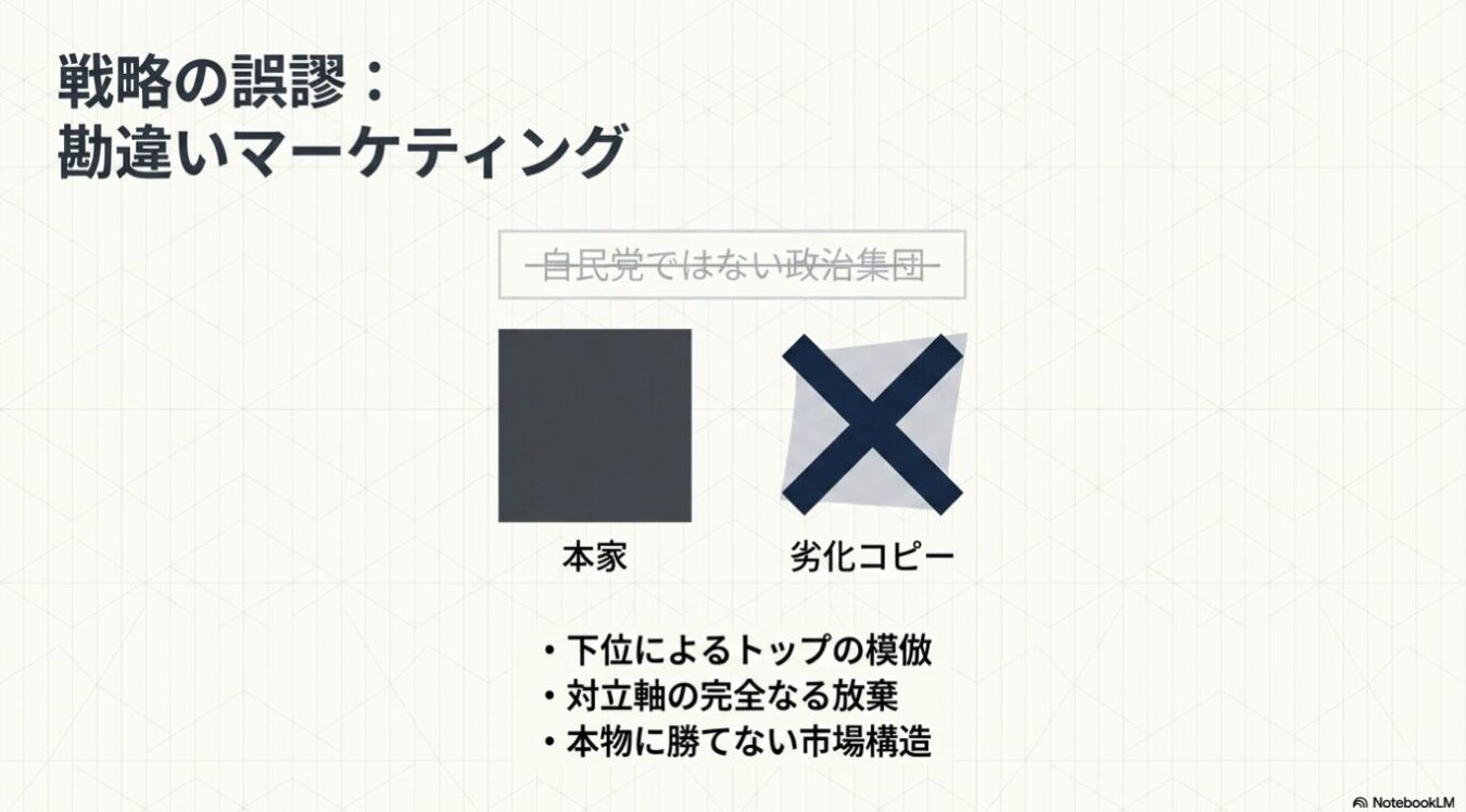 - 「自民党の言うことを聞く政治集団」を標榜する野党は、トヨタをパクる業界3位と同じ不潔な勘違いマーケティングの極み。