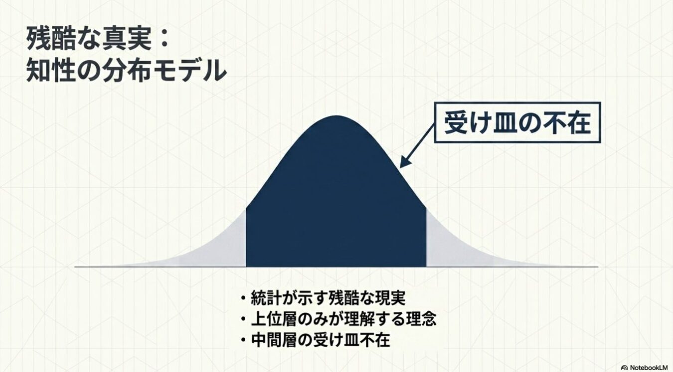 社会を正規分布のベルカーブで見たとき、上位の「ティア1」に属する賢い層は、論理的に共産党の理念を理解できる 。しかし、世の中の大半を占める偏差値45から65の層にとって、共産主義の思想は難しすぎて理解できないのだ 。字が読めない人間が本を読めないのと同じで、彼らには最初から「共産党」という選択肢は存在しない 。