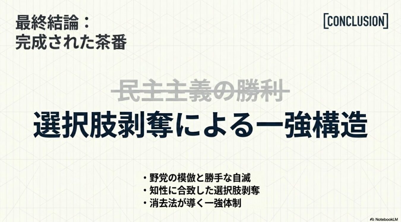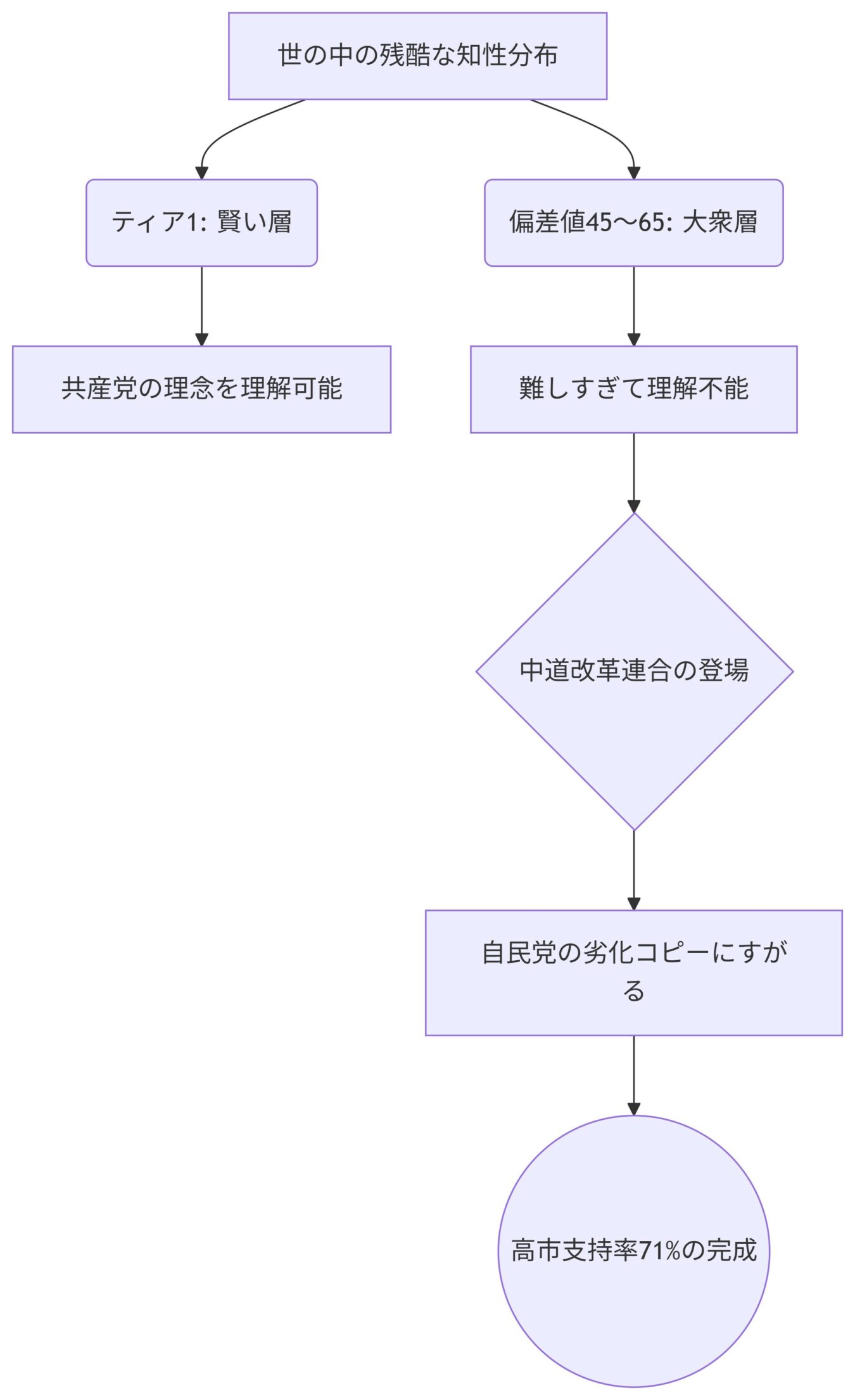 - 偏差値45〜65の層は共産党の理念を理解できず、結果として自民党の真似事をするだけの「受け皿」にすがるしかない残酷な現実。