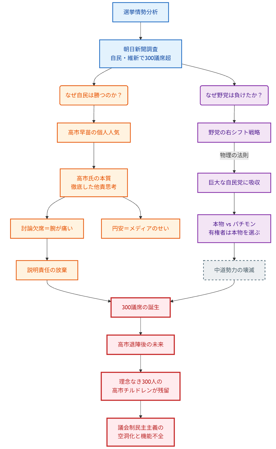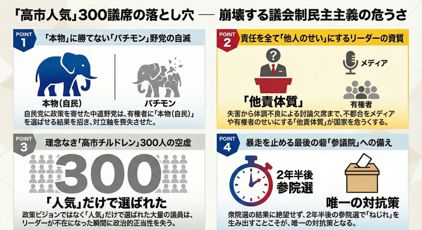 - 「高市チルドレン」の空虚さ:過去の小泉・安倍チルドレンとは異なり、明確な政治的争点(郵政や政権奪還)なく「高市人気」だけで当選する300議席は、彼女がいなくなった後に何の正当性も持たない「抜け殻」となる。