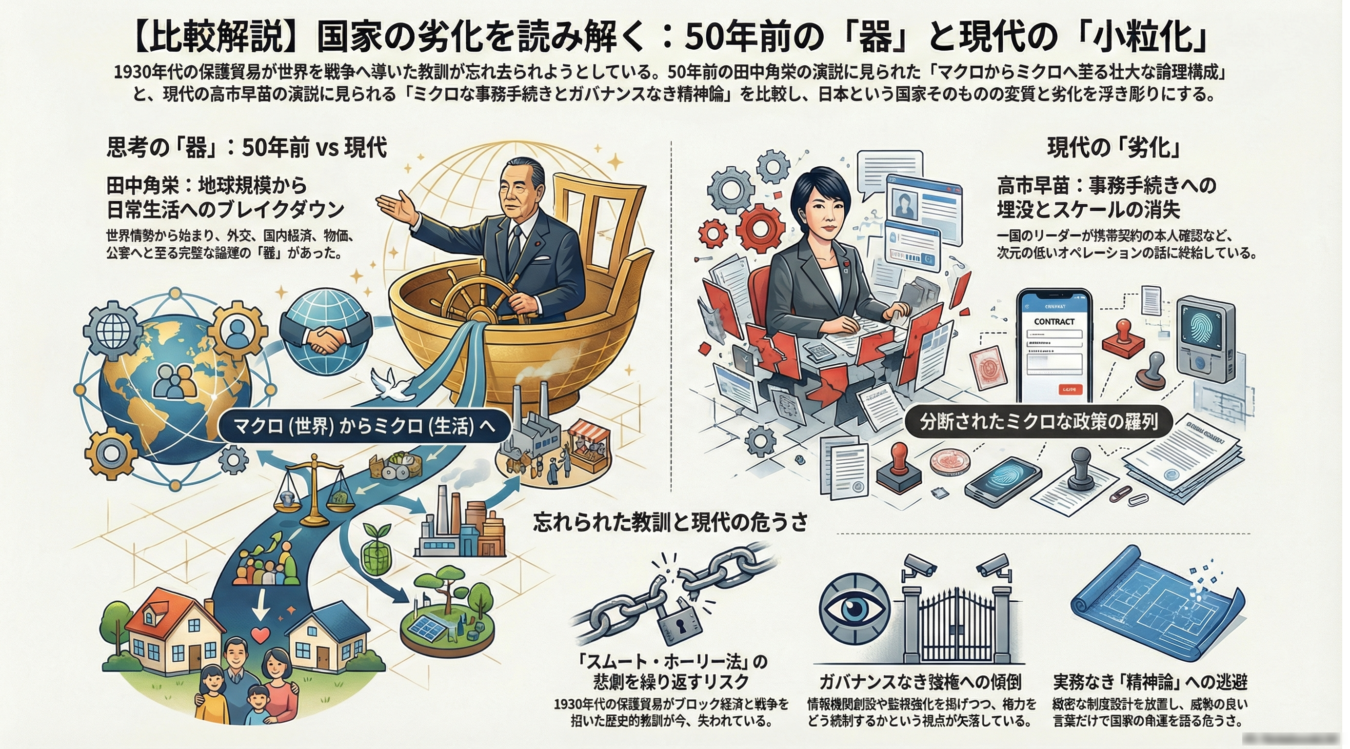 【結論】 高市早苗の施政方針演説は、歴史の教訓を完全に忘却した「知性なき精神論」の結晶である。到底実現不可能な「積極財政と債務削減の両立」というペテンや、財政民主主義の根幹を破壊する基金の乱用、そして憲法を軽視して弱者を叩く「ウィークネスフォビア」に満ちており、かつて地球儀を俯瞰していた日本の政治の「器」が、お猪口サイズにまで劣化した絶望的な現実を証明している。