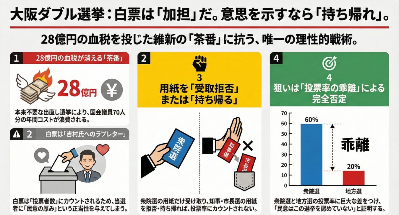 【結論】 大阪で行われるダブル選挙(知事・市長選)は、維新の党利党略による28億円の税金の無駄遣いであり、まともな対立候補も不在の「茶番」だ。この状況下で「白票」を投じることは、選挙の正当性を認め、維新を利するだけの「敗北宣言」に等しい。大阪府民がとるべき唯一の理性的行動は、衆院選には投票しつつ、知事・市長選の投票用紙を「受け取らない(拒否)」または「持ち帰る」ことだ。これにより、衆院選と地方選の投票率に極端な乖離(ギャップ)を生じさせ、数字をもって維新政治の正統性を否定せよ。