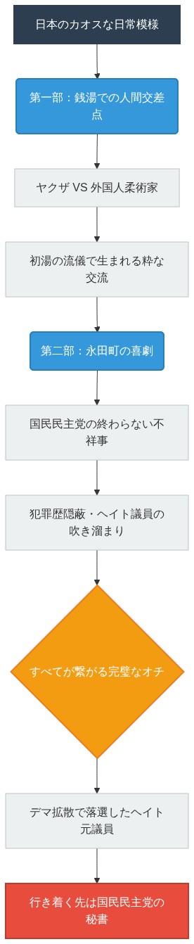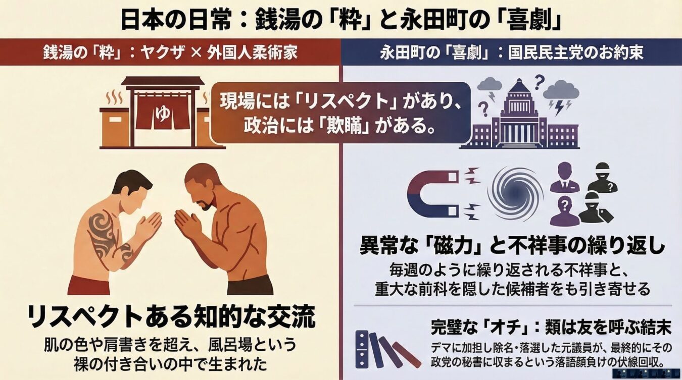 【結論】 日常の銭湯で繰り広げられるヤクザと外国人ファイターの粋な異文化交流と、永田町で繰り広げられる「国民民主党」の目を覆うような喜劇。この社会は、時に落語よりも見事な伏線回収とオチを見せてくれる。ヘイトやデマに踊らされる「弱者」たちの滑稽さと、特定の政党が惹きつける「類は友を呼ぶ」現象を鋭く切り取る。